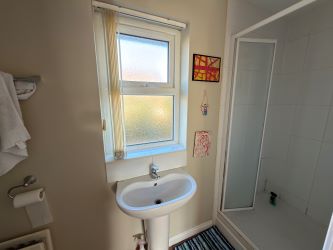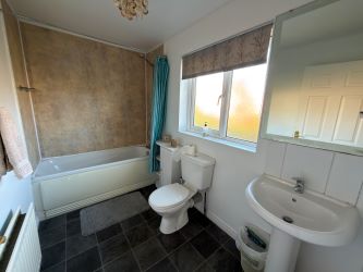 Bathroom: White suite comprising, panelled bath with telephone hand shower, low flush w/c, pedestal wash hand basin with mixer tap.