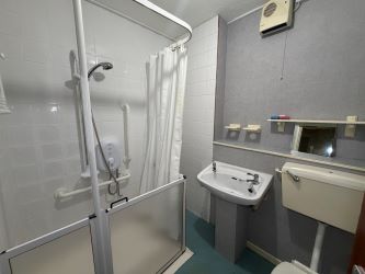 Classic white bathroom suite comprising disabled shower cubical with electric shower, wash hand basin , low flush wc, partly tiled walls, panelled radiator.